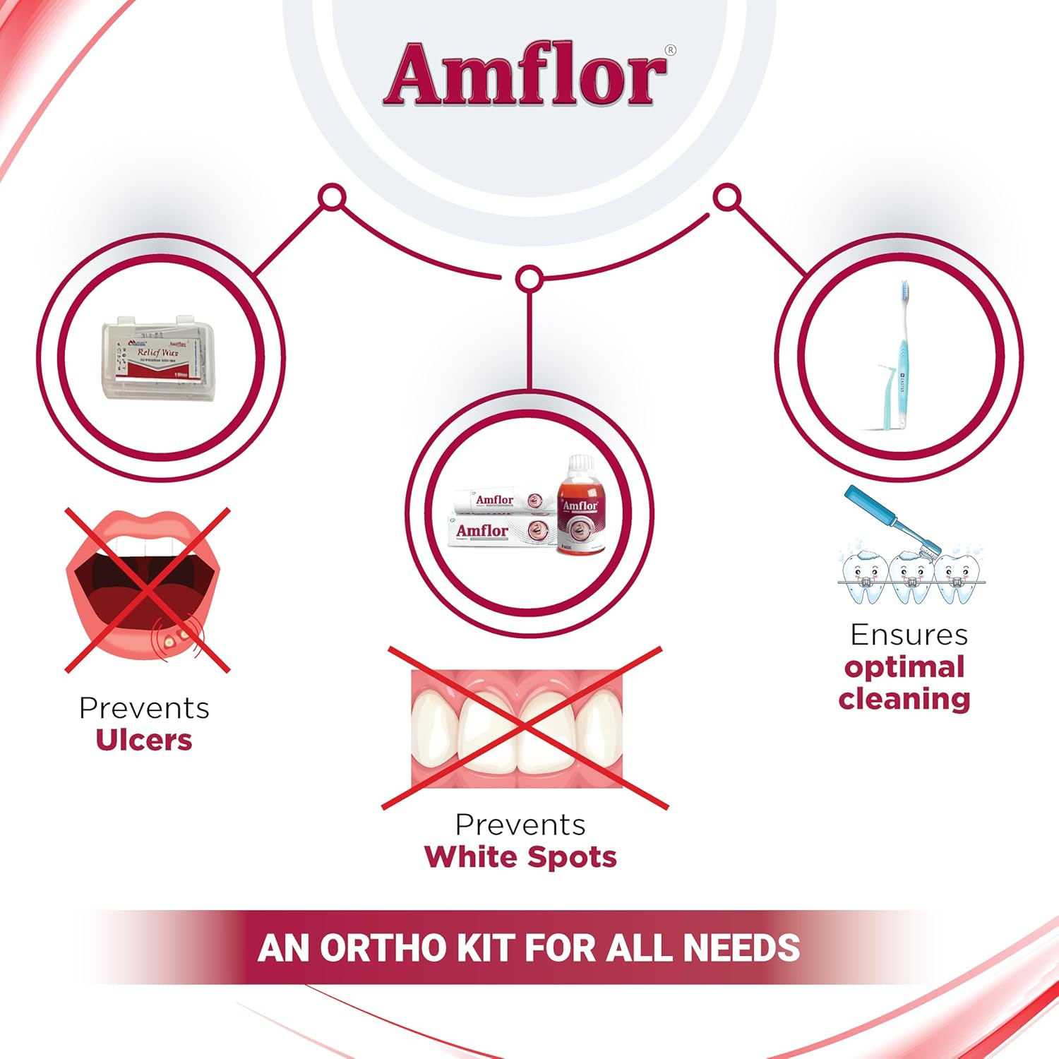 - COMPLETE ORTHODONTIC CARE: Everything you need for daily hygiene while wearing braces, including Amflor Toothpaste, Amflor Mouthwash, Orthodontic Brush, Interdental Brush, and Protective Dental Wax.