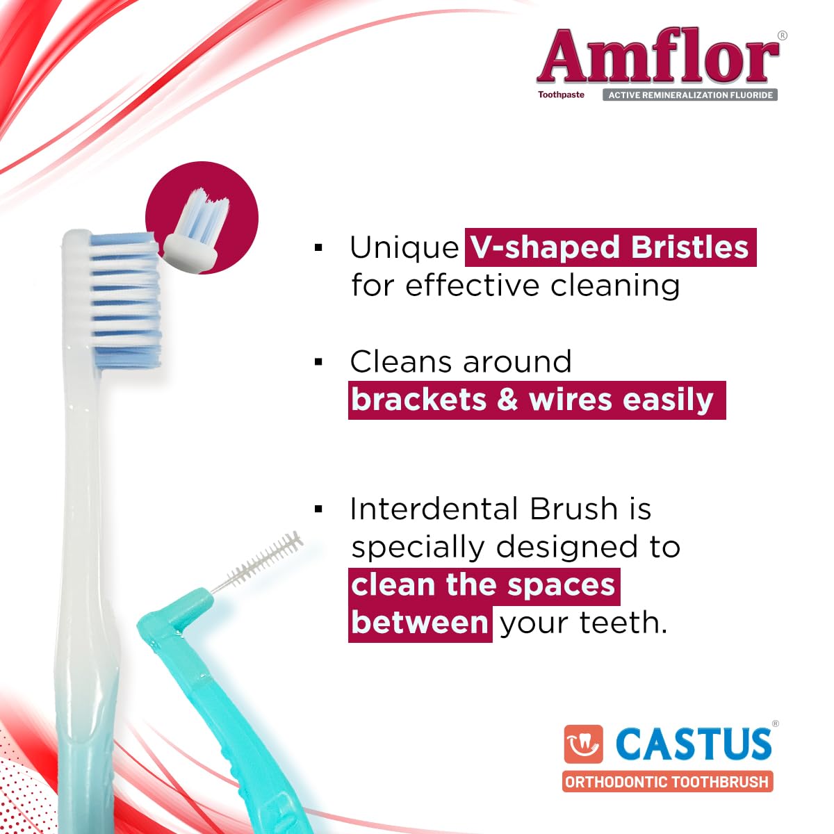 - PRECISION CLEANING TOOLS: Features a specialized Castus Orthodontic Toothbrush with V-cut bristles designed to clean effectively around brackets and wires, plus an Interdental Brush to reach tight spaces and under the archwire.