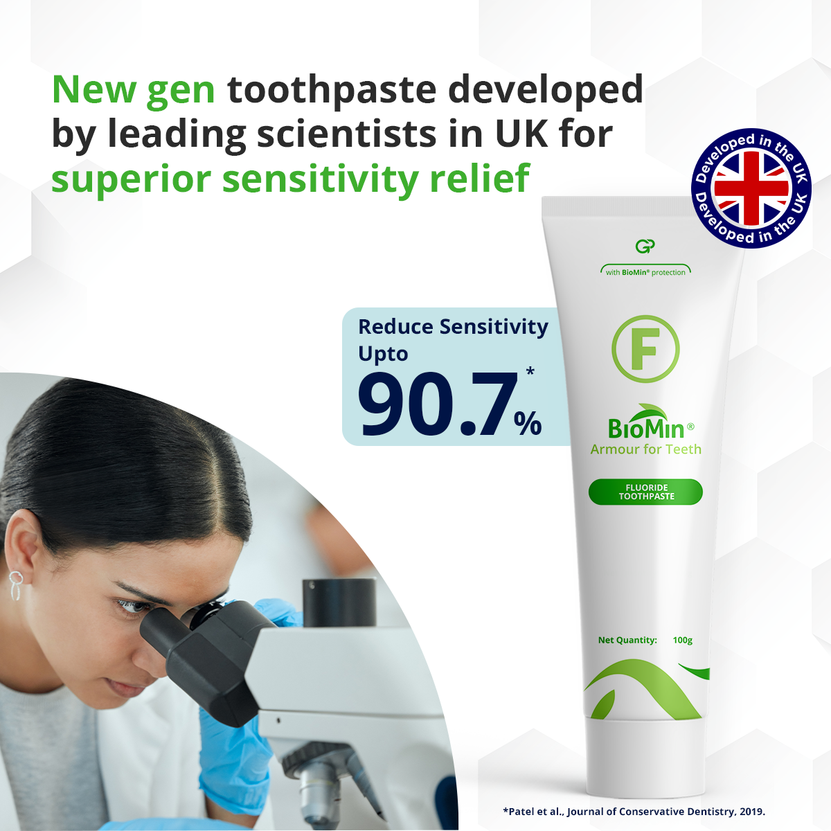 Introducing BioMin® F Toothpaste, an award-winning toothpaste powered by patented bioactive glass technology. Recognised internationally and developed in the UK, BioMin® F is engineered to slowly release fluoride, calcium and phosphate ions for up to 12 hours, helping strengthen enamel, protect against acid attack, and provide lasting relief from sensitive teeth.