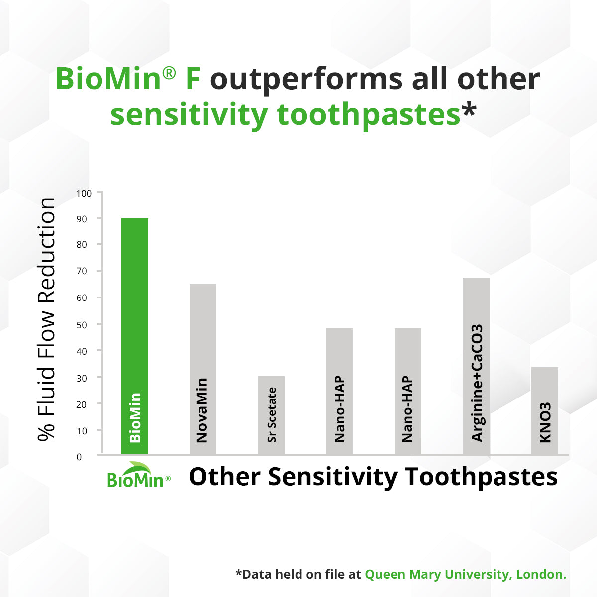 BioMin® F is engineered with extra-fine particles that penetrate and occlude open dentinal tubules the root cause of sensitivity. This provides effective, long-lasting relief from sensitivity triggered by hot, cold or sweet foods.