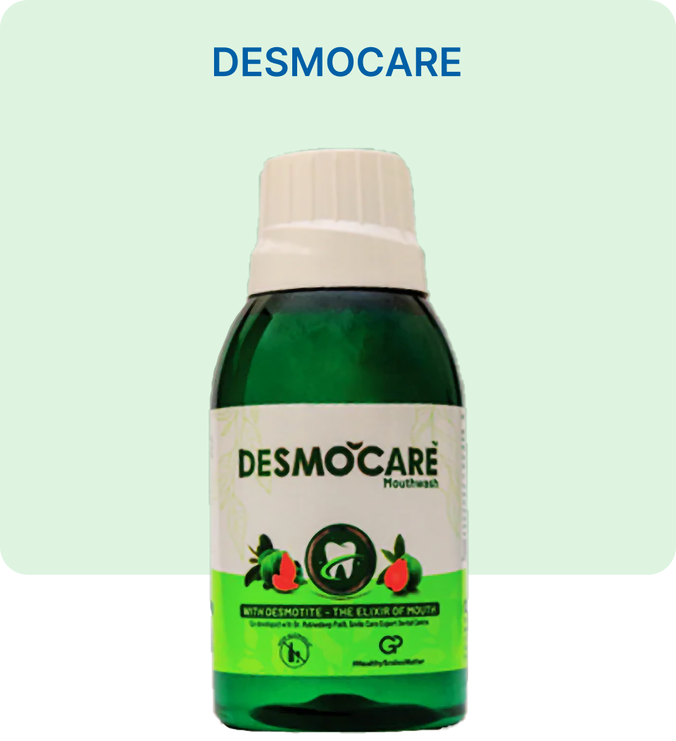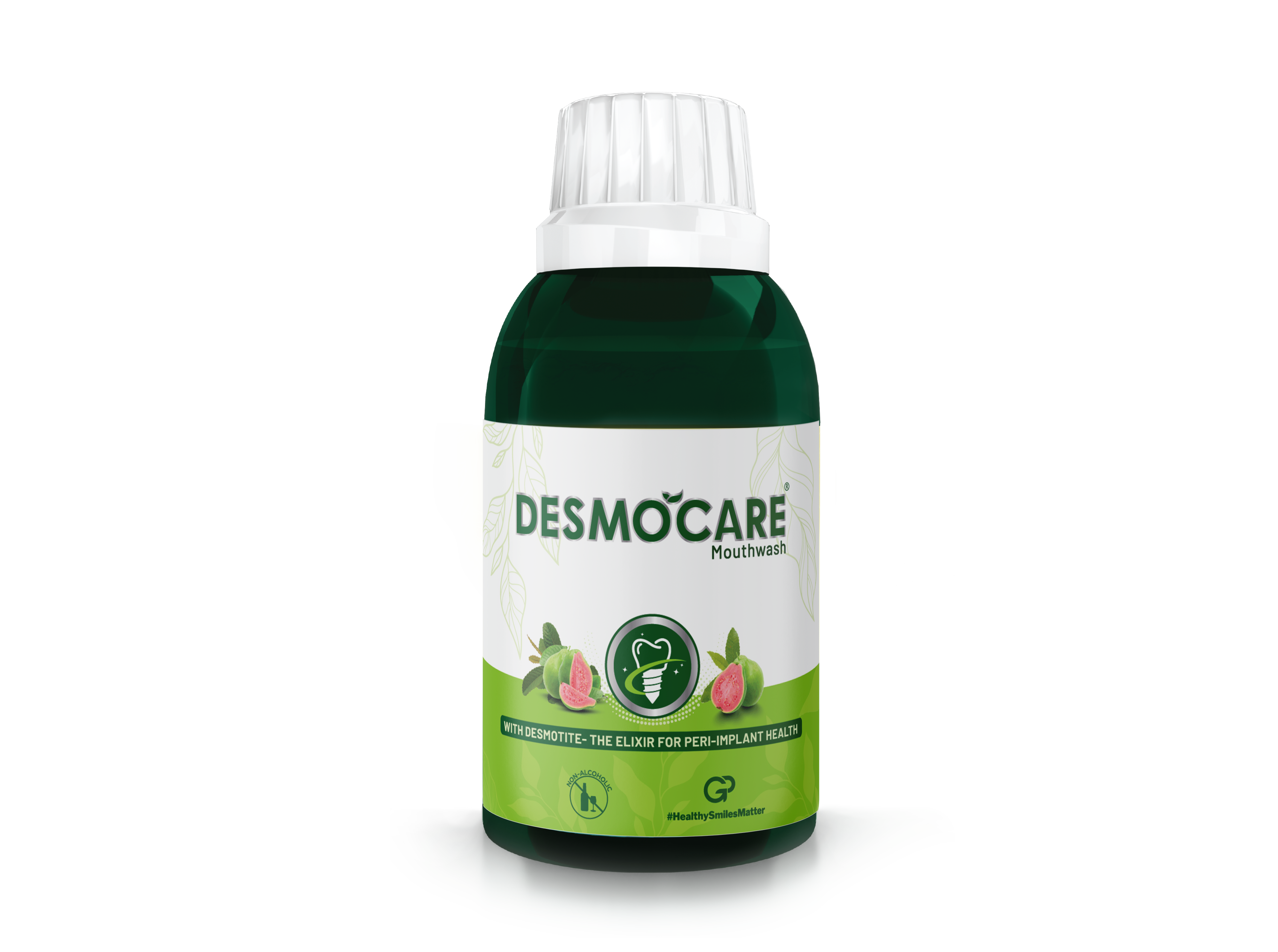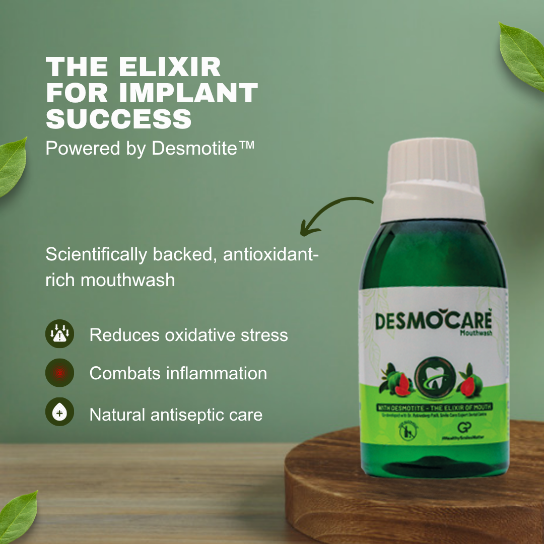 Desmocare is a scientifically backed, antioxidant-rich mouthwash designed to support post-surgical dental implant healing and promote long-term implant success. Powered by Desmotite™, it reduces oxidative stress, combats inflammation, provides natural antiseptic care and eliminates harmful microorganisms while providing gentle, natural antiseptic care for long-term implant maintenance.