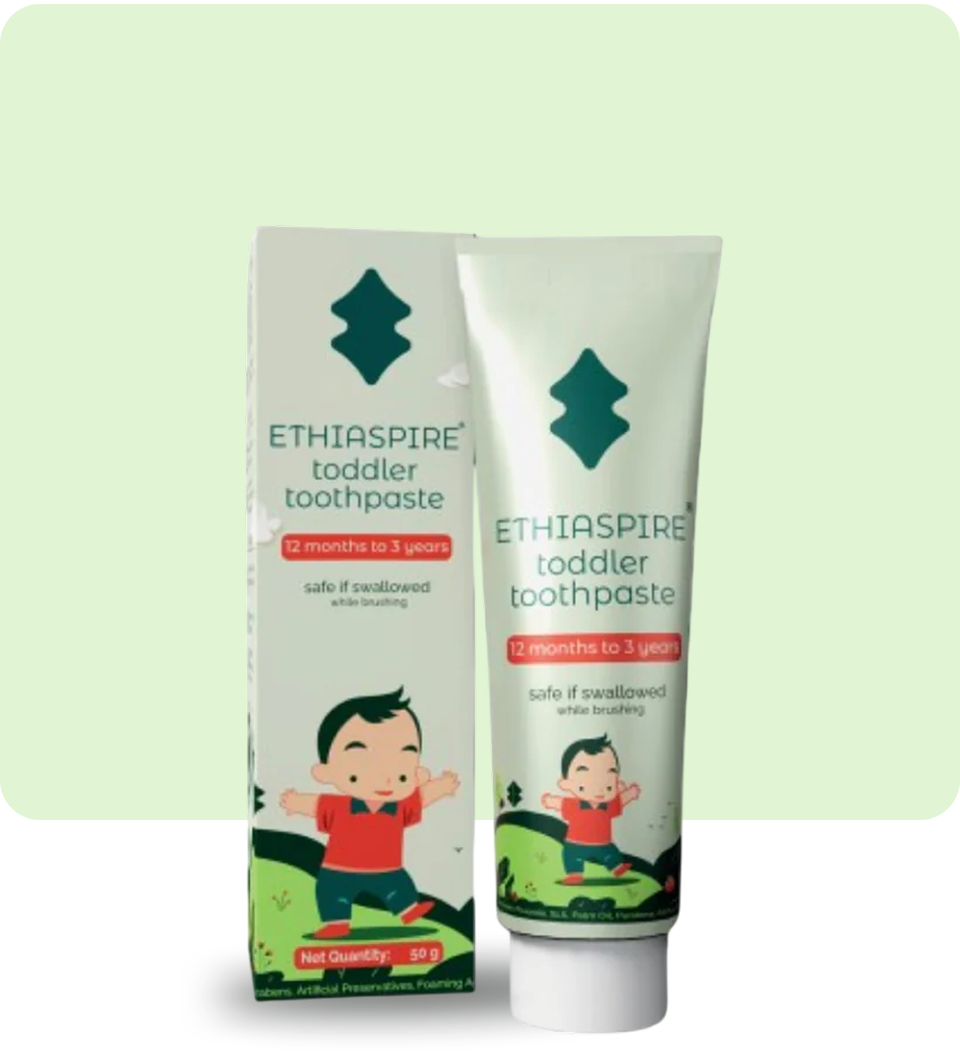 Ethiaspire toddler toothpaste is a safe if swallowed toothpaste, made from 6 common FSSAI-listed food ingredients for toddlers from their first tooth to 3 years of age. It’s vegan-friendly, and carbon-neutral.